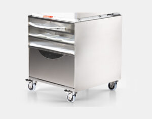 A kocsi rozsdamentes acélból készült, táskatartó rekeszekkel és ajtókkal rendelkezik, amelyek edények, kiegészítők és szerszámok tárolására szolgálnak.